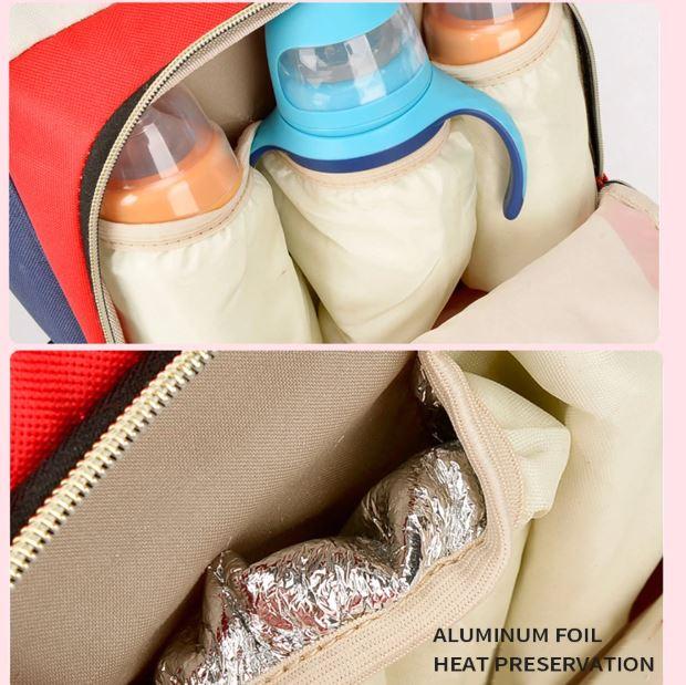 En la parte frontal, la mochila tiene un compartimento especial para llevar los biberones revestido con material térmico para mantener la temperatura de los alimentos.